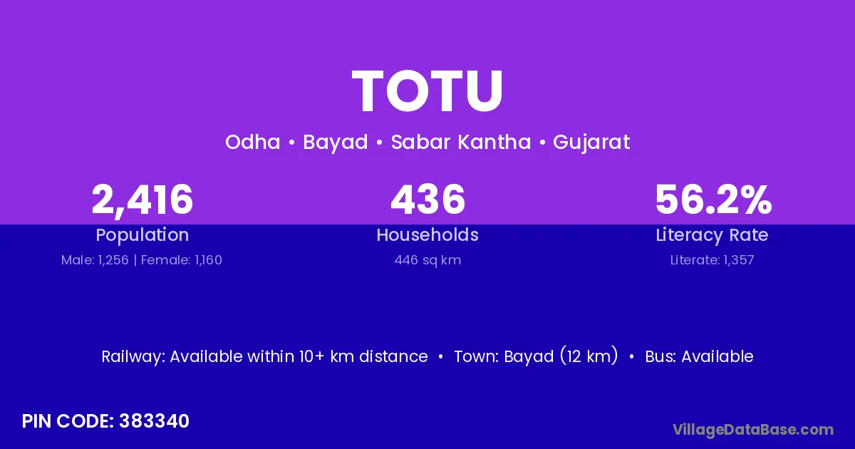 Bayad (12 km) is the nearest town to Totu village for major economic activities and is located approximately 12 km away.