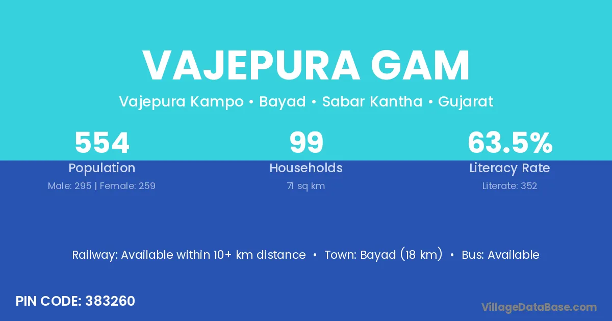 Bayad (18 km) is the nearest town to Vajepura Gam village for major economic activities and is located approximately 18 km away.