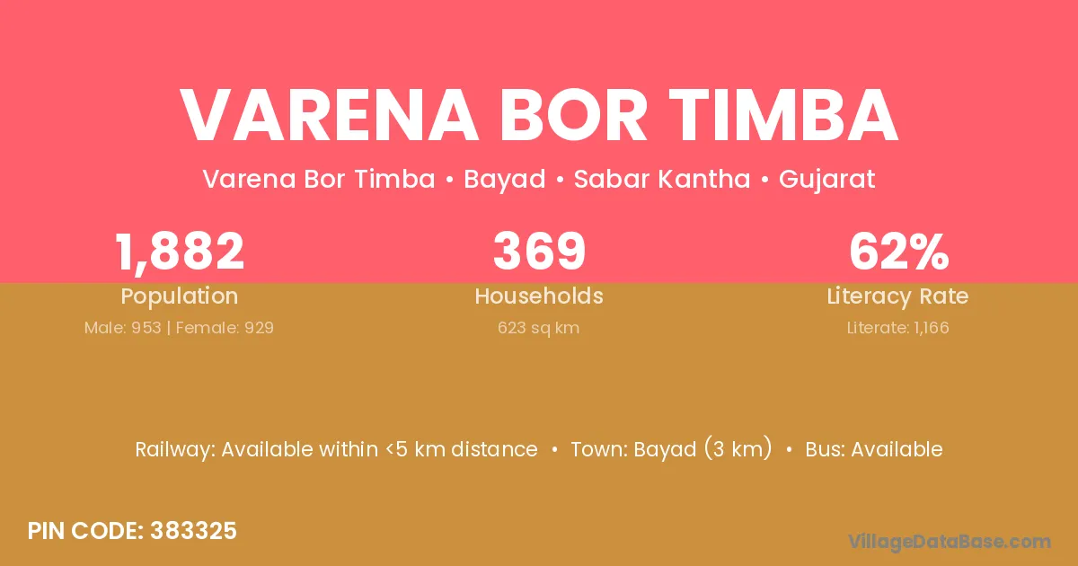Bayad (3 km) is the nearest town to Varena Bor Timba village for major economic activities and is located approximately 3 km away.