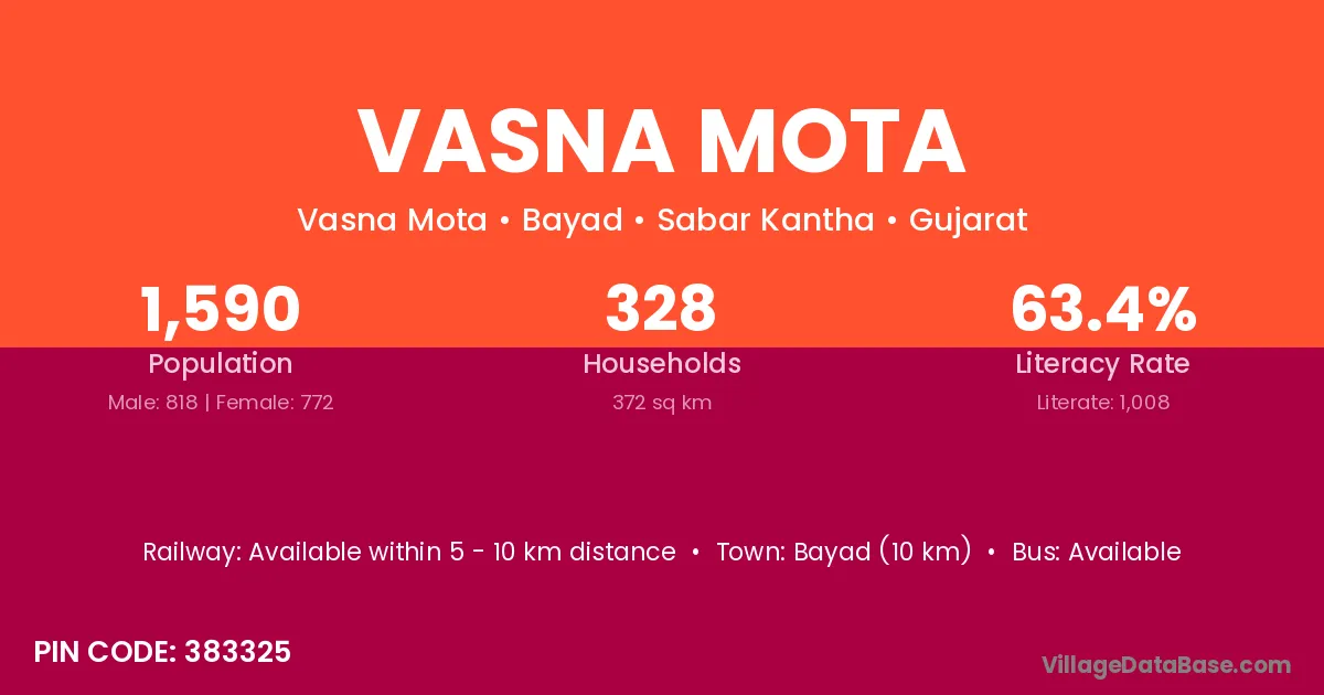 Bayad (10 km) is the nearest town to Vasna Mota village for major economic activities and is located approximately 10 km away.