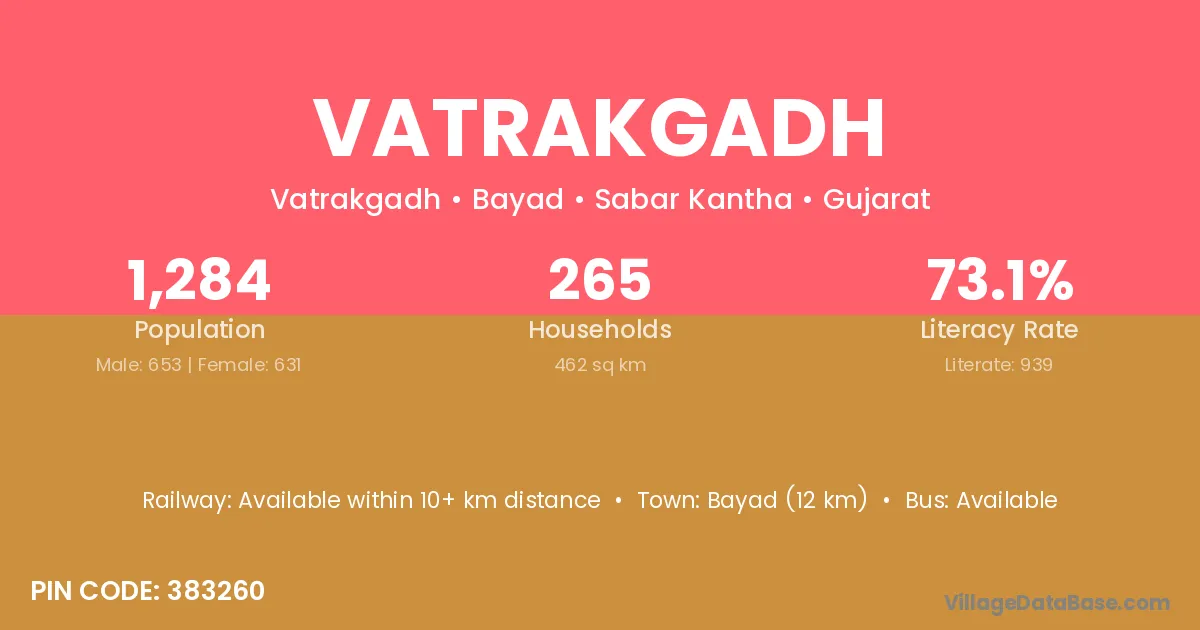 Vatrakgadh village has a total population of 1,284 people, of which 653 are males and 631 are females.
