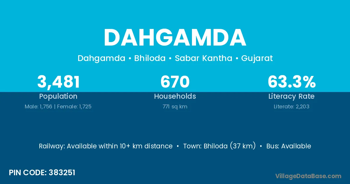 Bhiloda (37 km) is the nearest town to Dahgamda village for major economic activities and is located approximately 37 km away.