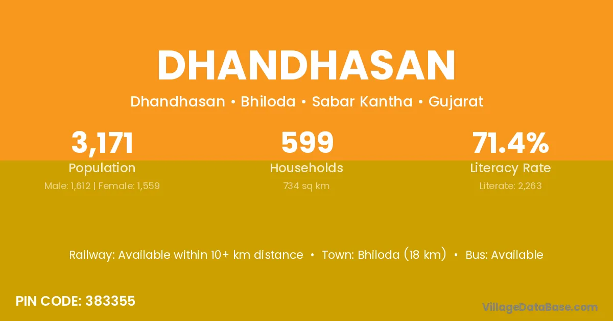 Bhiloda (18 km) is the nearest town to Dhandhasan village for major economic activities and is located approximately 18 km away.