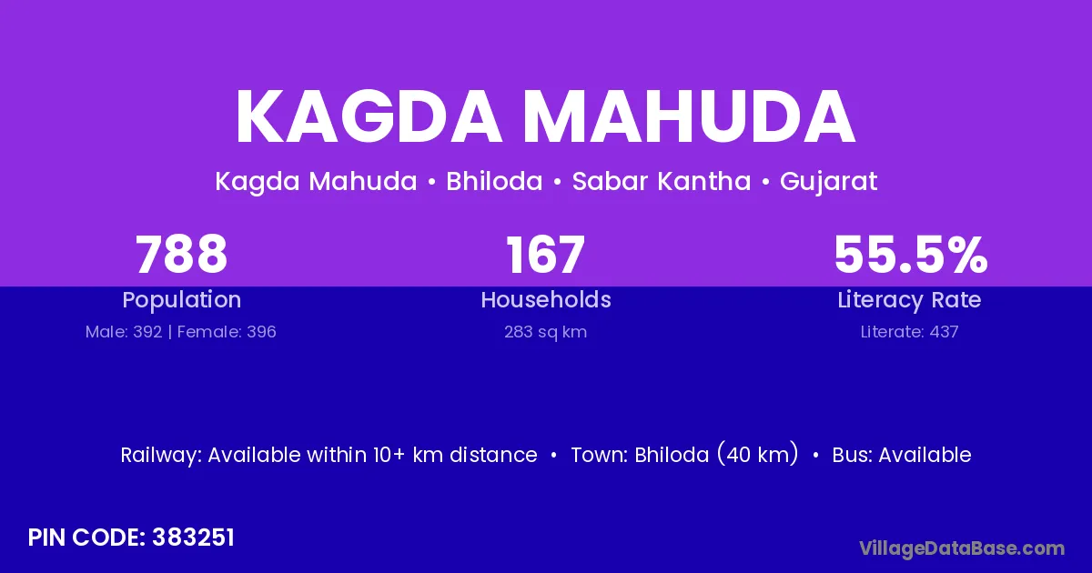 Bhiloda (40 km) is the nearest town to Kagda Mahuda village for major economic activities and is located approximately 40 km away.