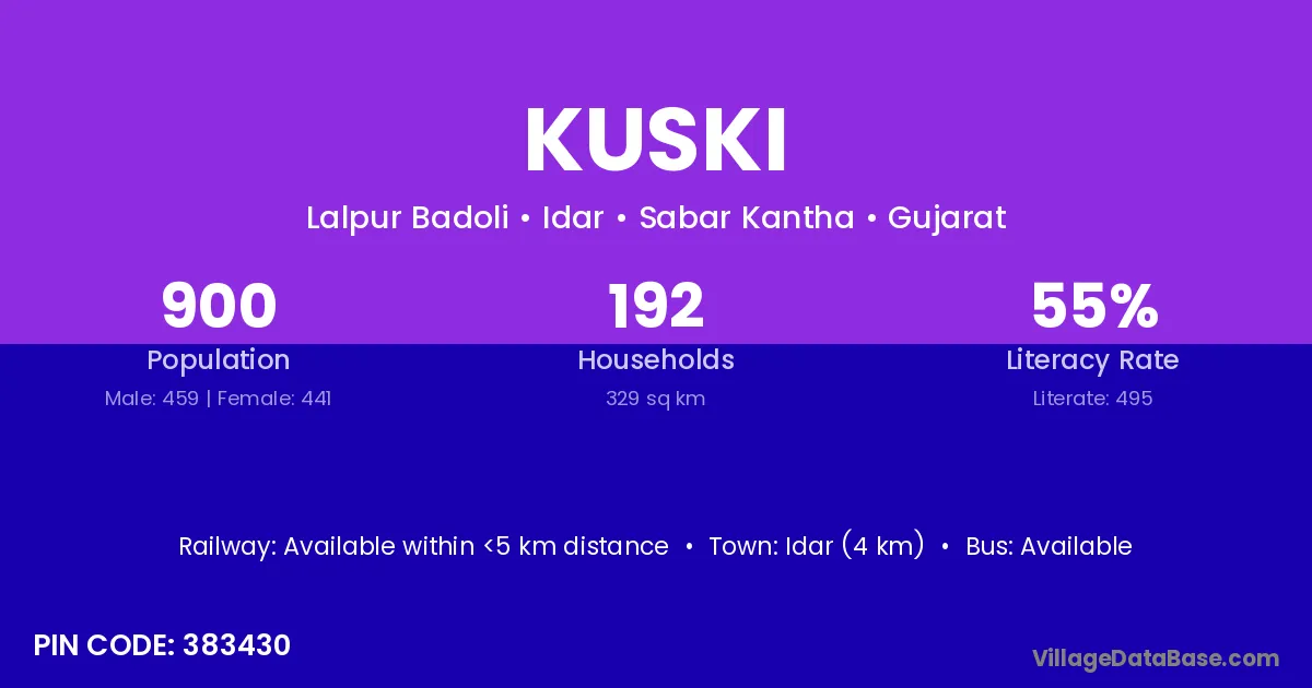 Modasa (25 km) is the nearest town to Kuski village for major economic activities and is located approximately 25 km away.