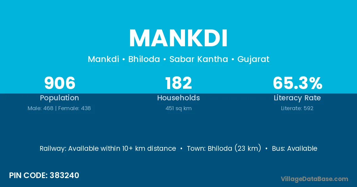 Bhiloda (23 km) is the nearest town to Mankdi village for major economic activities and is located approximately 23 km away.