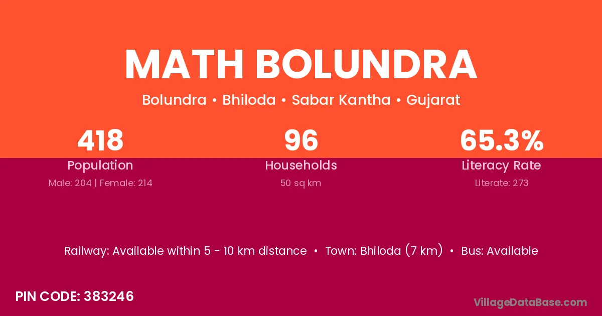 Bhiloda (7 km) is the nearest town to Math Bolundra village for major economic activities and is located approximately 7 km away.