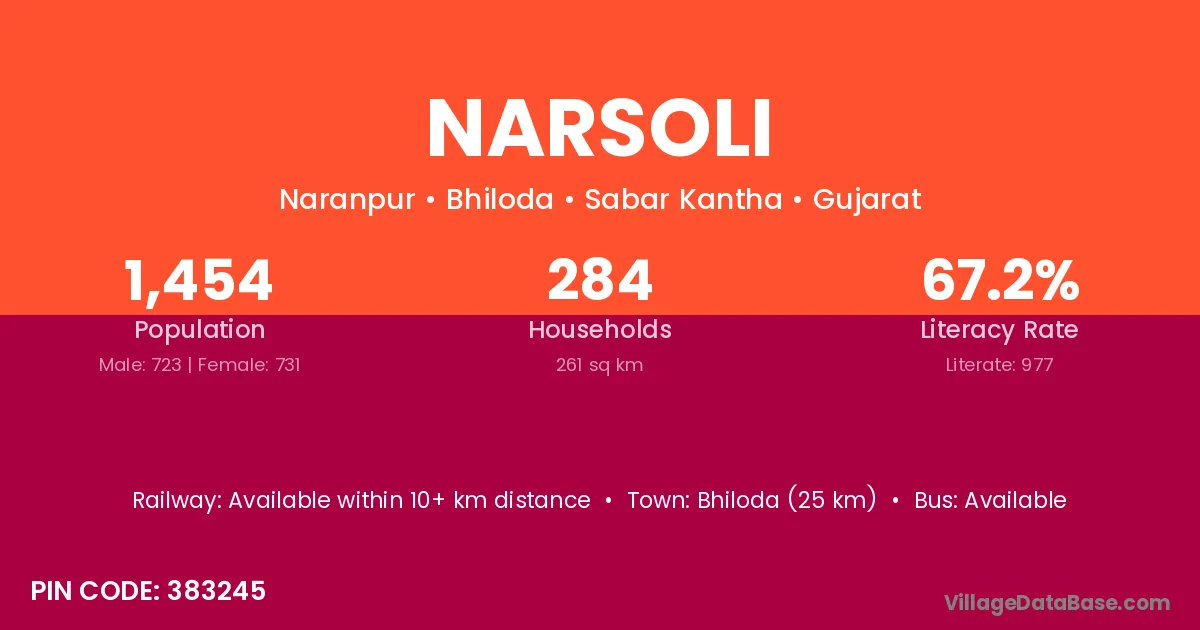 Bhiloda (25 km) is the nearest town to Narsoli village for major economic activities and is located approximately 25 km away.