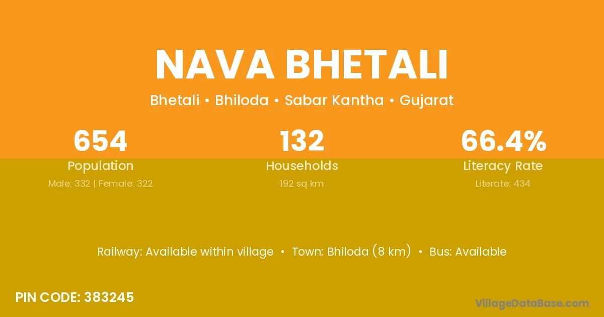 Bhiloda (8 km) is the nearest town to Nava Bhetali village for major economic activities and is located approximately 8 km away.
