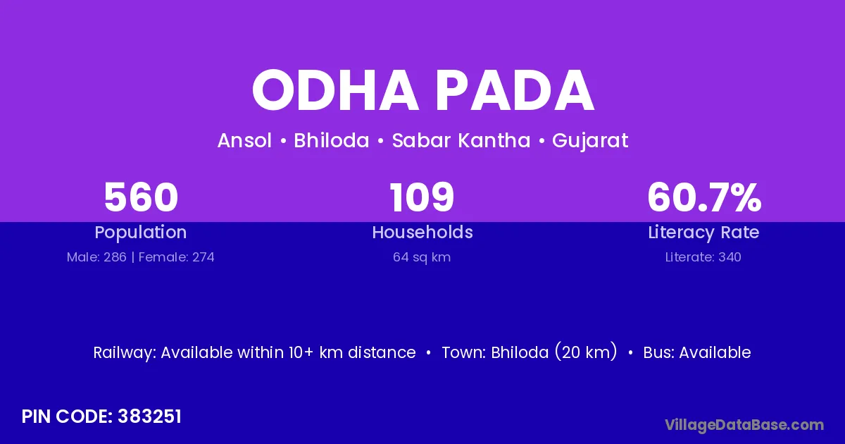 Bhiloda (20 km) is the nearest town to Odha Pada village for major economic activities and is located approximately 20 km away.