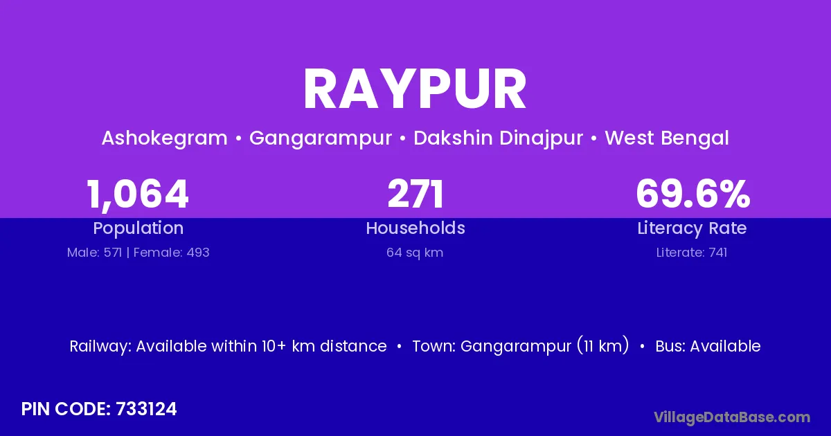 Bhiloda (12 km) is the nearest town to Raypur village for major economic activities and is located approximately 12 km away.