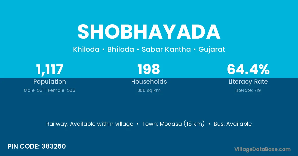 Modasa (15 km) is the nearest town to Shobhayada village for major economic activities and is located approximately 15 km away.