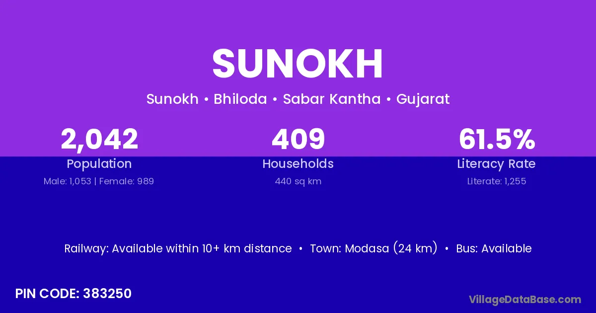Modasa (24 km) is the nearest town to Sunokh village for major economic activities and is located approximately 24 km away.