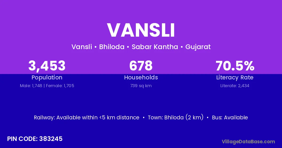 Bhiloda (2 km) is the nearest town to Vansli village for major economic activities and is located approximately 2 km away.