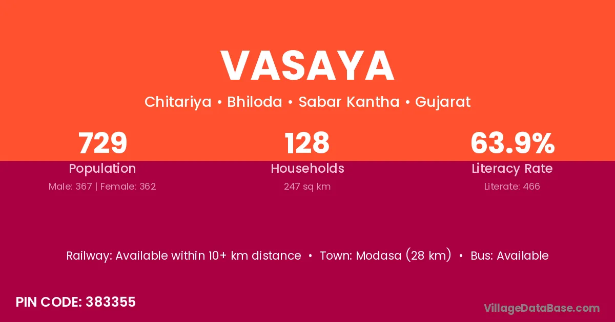 Modasa (28 km) is the nearest town to Vasaya village for major economic activities and is located approximately 28 km away.