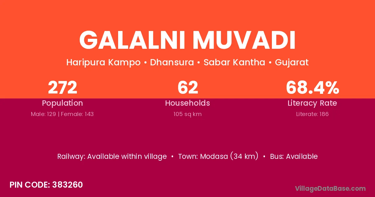 Modasa (34 km) is the nearest town to Galalni Muvadi village for major economic activities and is located approximately 34 km away.