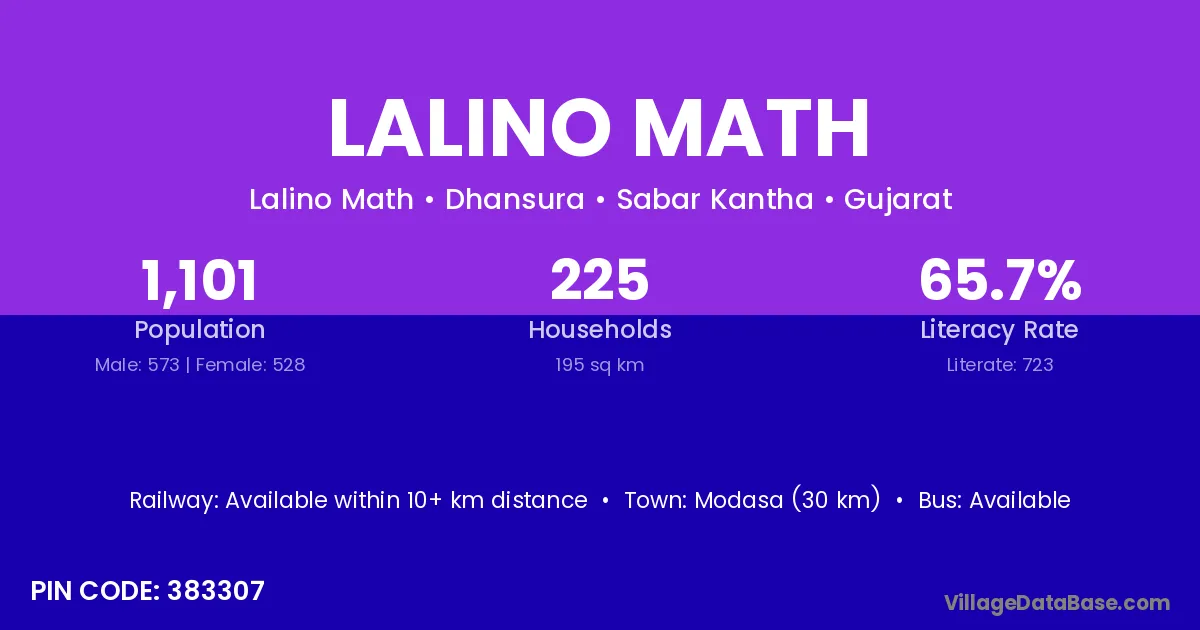 Modasa (30 km) is the nearest town to Lalino Math village for major economic activities and is located approximately 30 km away.