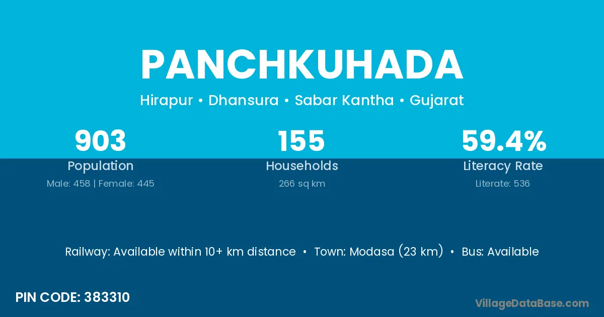 Modasa (23 km) is the nearest town to Panchkuhada village for major economic activities and is located approximately 23 km away.