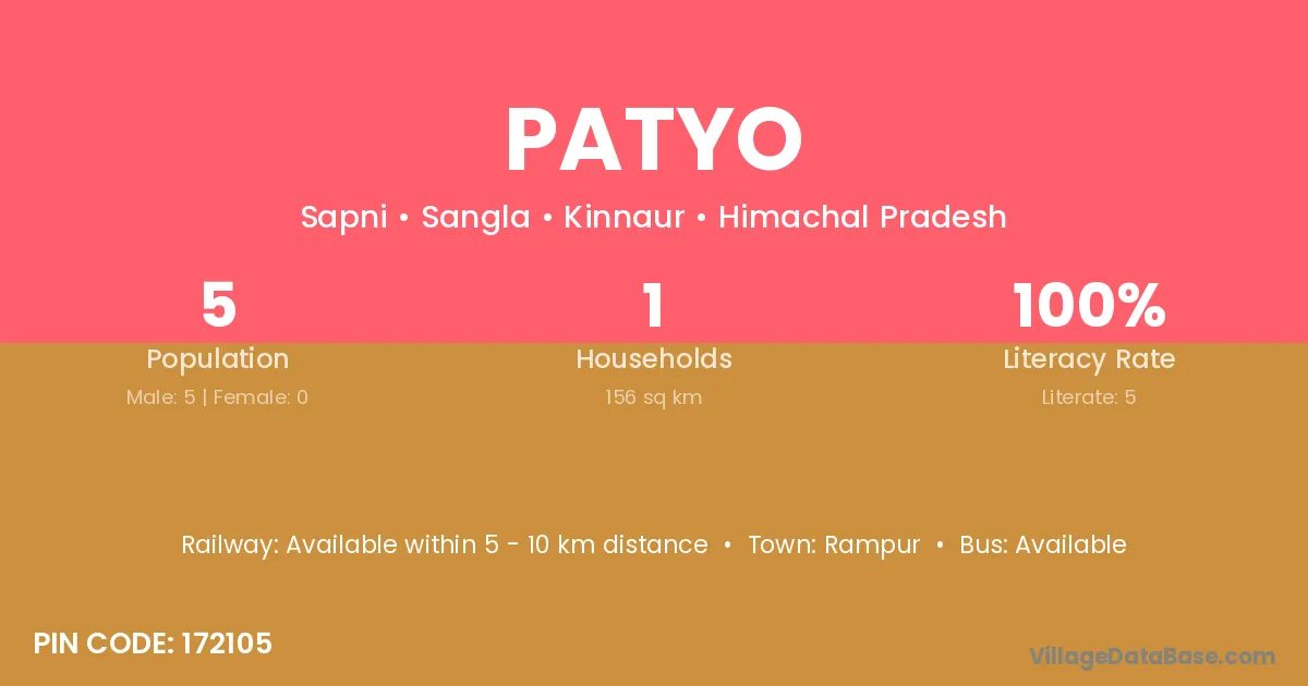 Patyo village has a total population of 220 people, of which 117 are males and 103 are females.