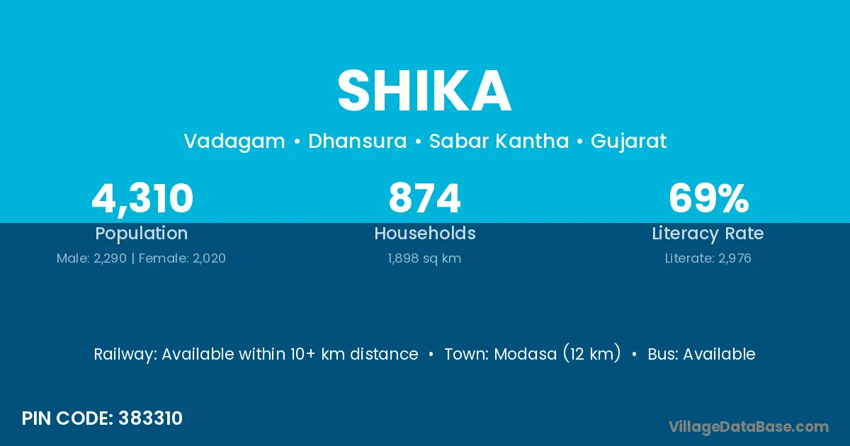 Modasa (12 km) is the nearest town to Shika village for major economic activities and is located approximately 12 km away.