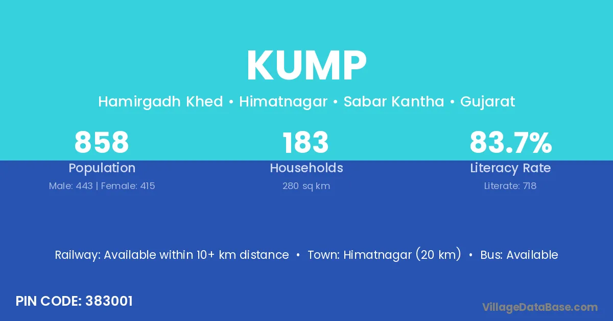 Himatnagar (20 km) is the nearest town to Kump village for major economic activities and is located approximately 20 km away.