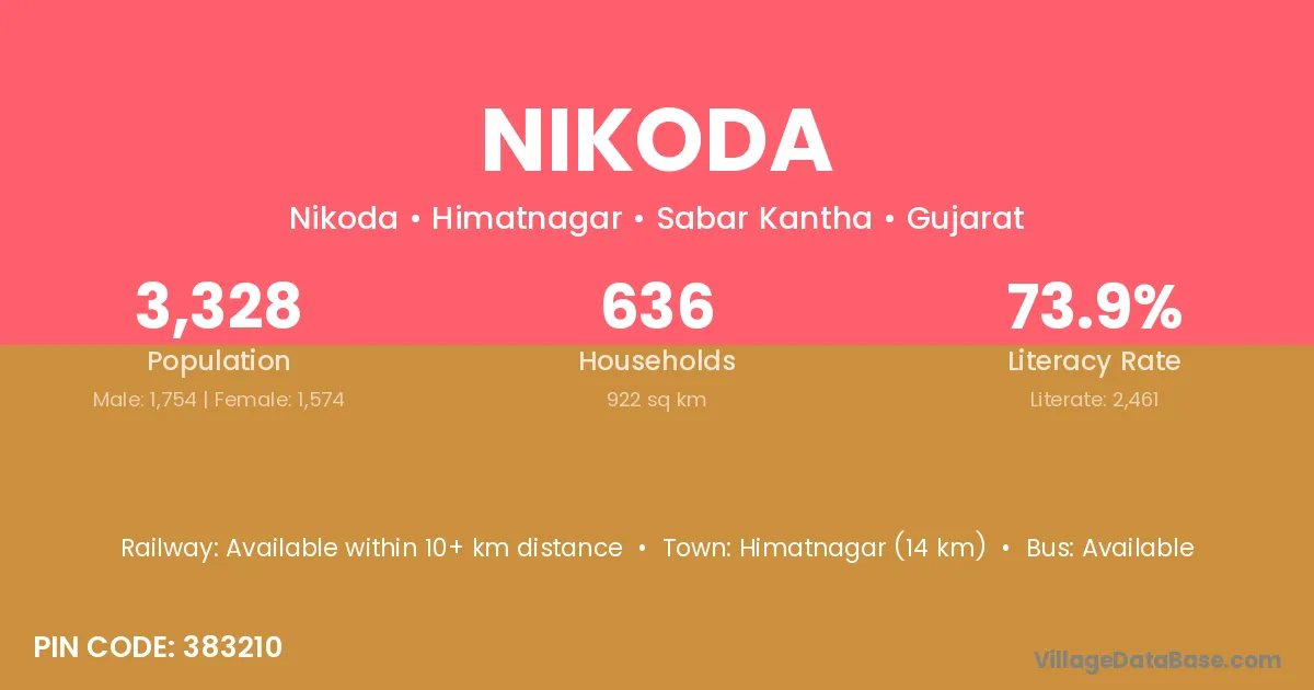 Himatnagar (14 km) is the nearest town to Nikoda village for major economic activities and is located approximately 14 km away.