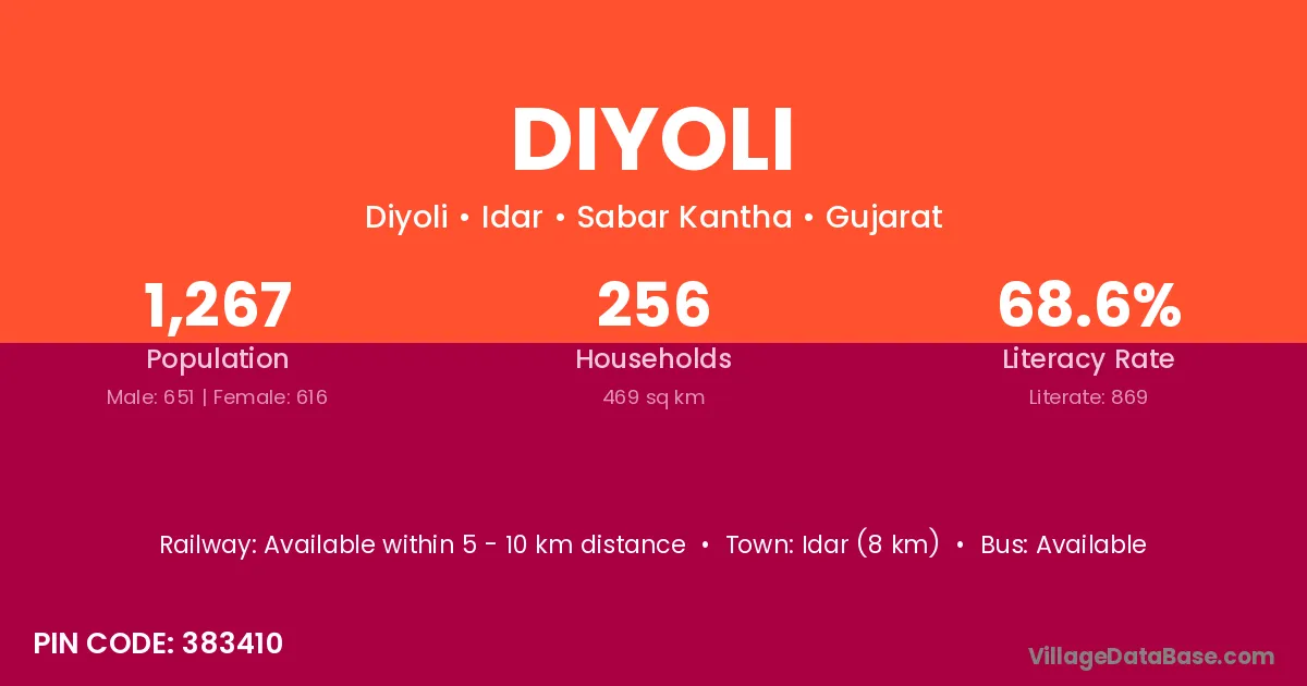 Idar (8 km) is the nearest town to Diyoli village for major economic activities and is located approximately 8 km away.
