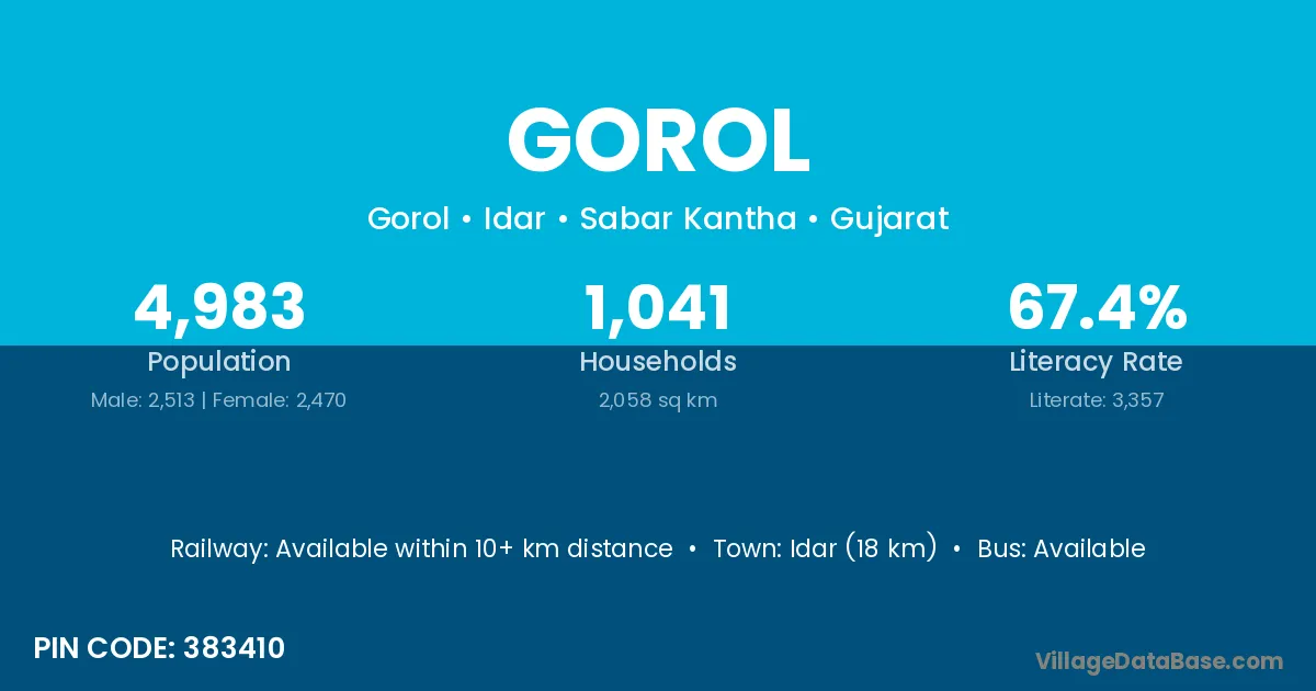 Idar (18 km) is the nearest town to Gorol village for major economic activities and is located approximately 18 km away.