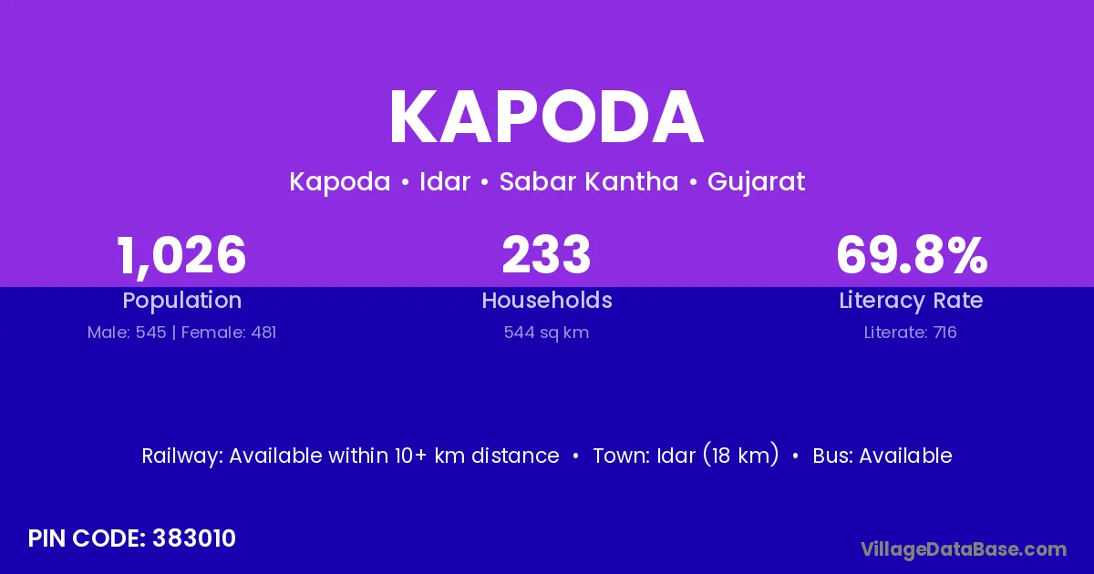 Idar (18 km) is the nearest town to Kapoda village for major economic activities and is located approximately 18 km away.