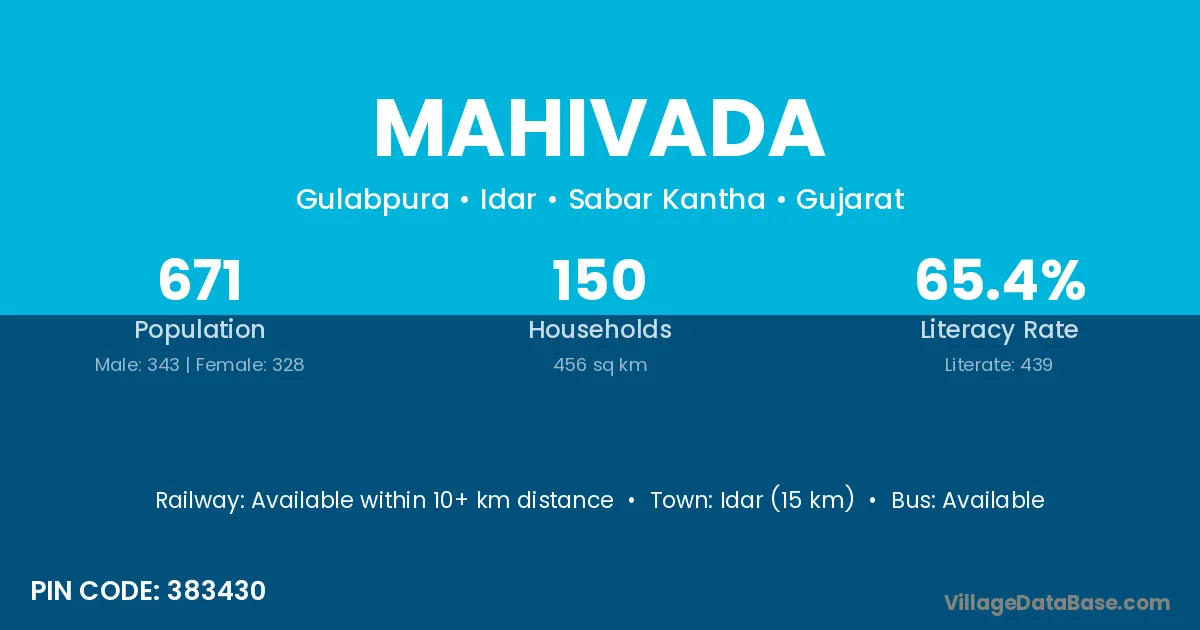 Idar (15 km) is the nearest town to Mahivada village for major economic activities and is located approximately 15 km away.
