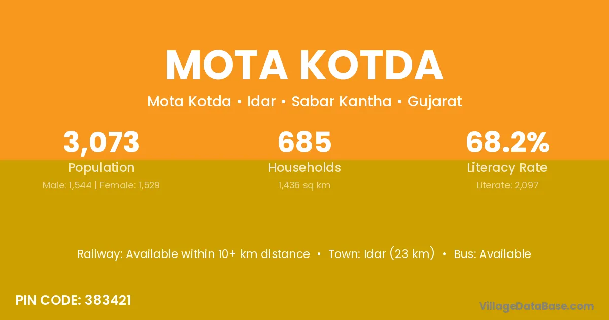 Idar (23 km) is the nearest town to Mota Kotda village for major economic activities and is located approximately 23 km away.