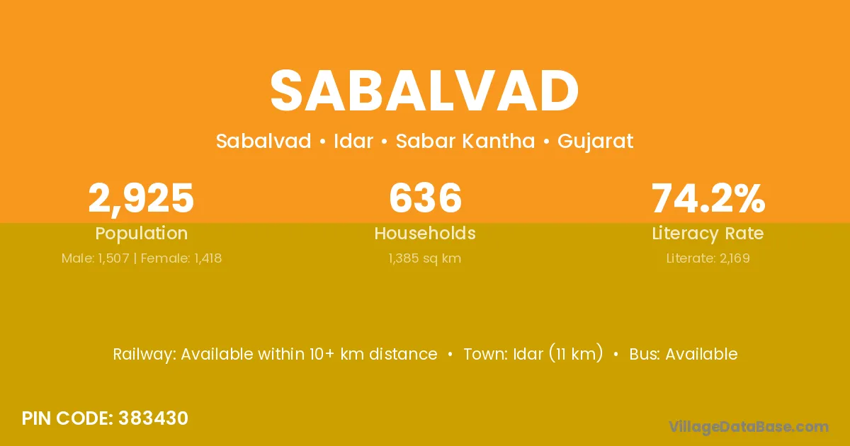 Idar (11 km) is the nearest town to Sabalvad village for major economic activities and is located approximately 11 km away.