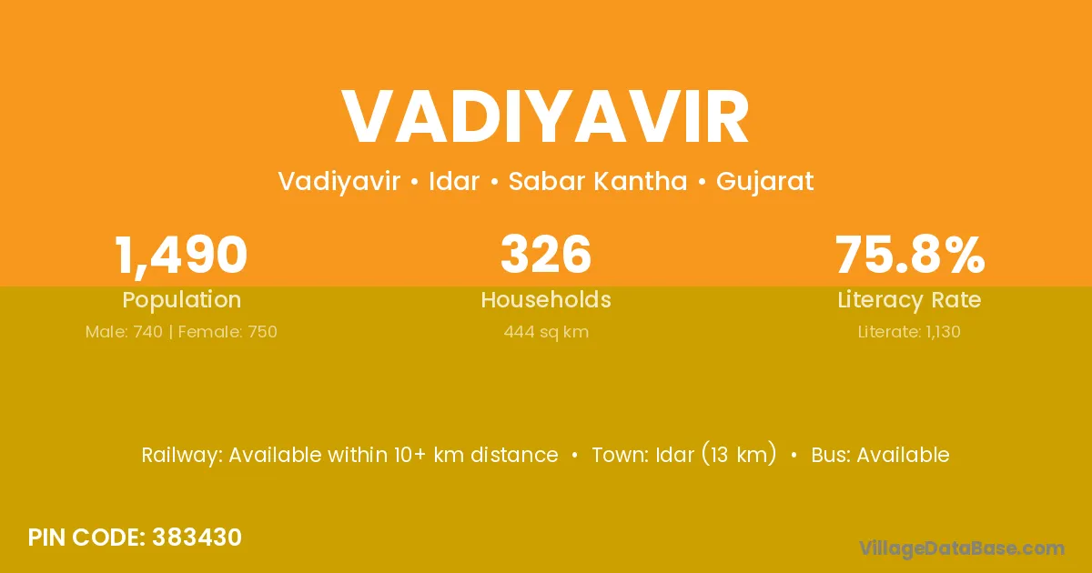 Idar (13 km) is the nearest town to Vadiyavir village for major economic activities and is located approximately 13 km away.