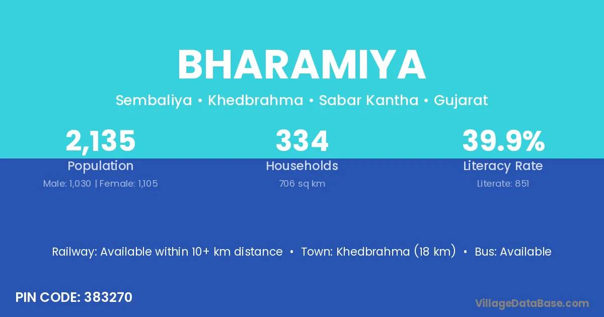 Khedbrahma (18 km) is the nearest town to Bharamiya village for major economic activities and is located approximately 18 km away.