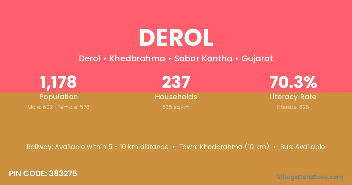 Khedbrahma (10 km) is the nearest town to Derol village for major economic activities and is located approximately 10 km away.