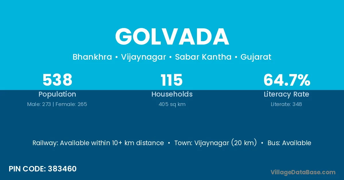 Khedbrahma (36 km) is the nearest town to Golvada village for major economic activities and is located approximately 36 km away.