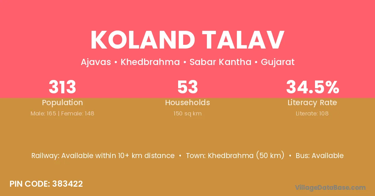Khedbrahma (50 km) is the nearest town to Koland Talav village for major economic activities and is located approximately 50 km away.