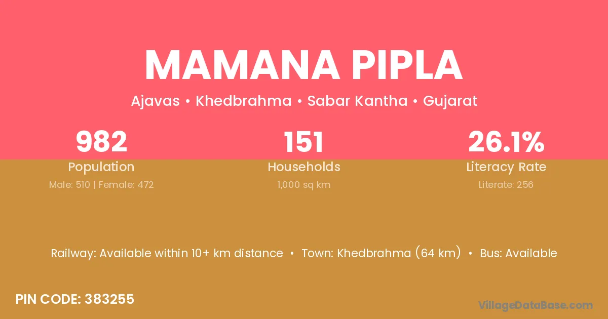 Khedbrahma (64 km) is the nearest town to Mamana Pipla village for major economic activities and is located approximately 64 km away.