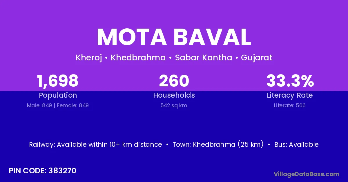 Khedbrahma (25 km) is the nearest town to Mota Baval village for major economic activities and is located approximately 25 km away.