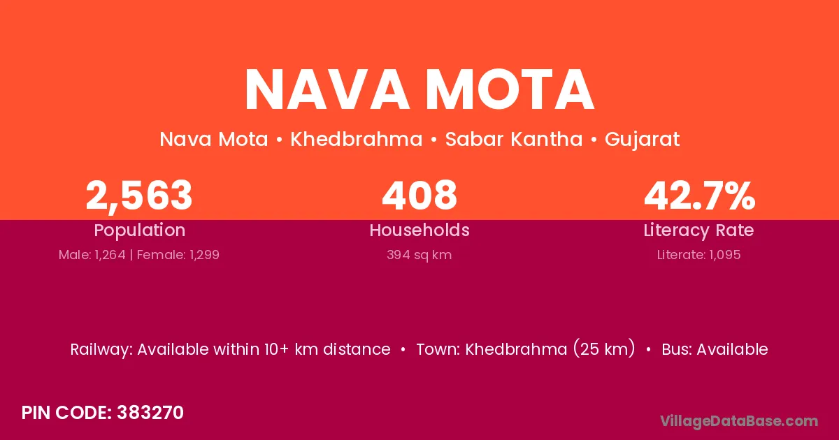 Khedbrahma (25 km) is the nearest town to Nava Mota village for major economic activities and is located approximately 25 km away.