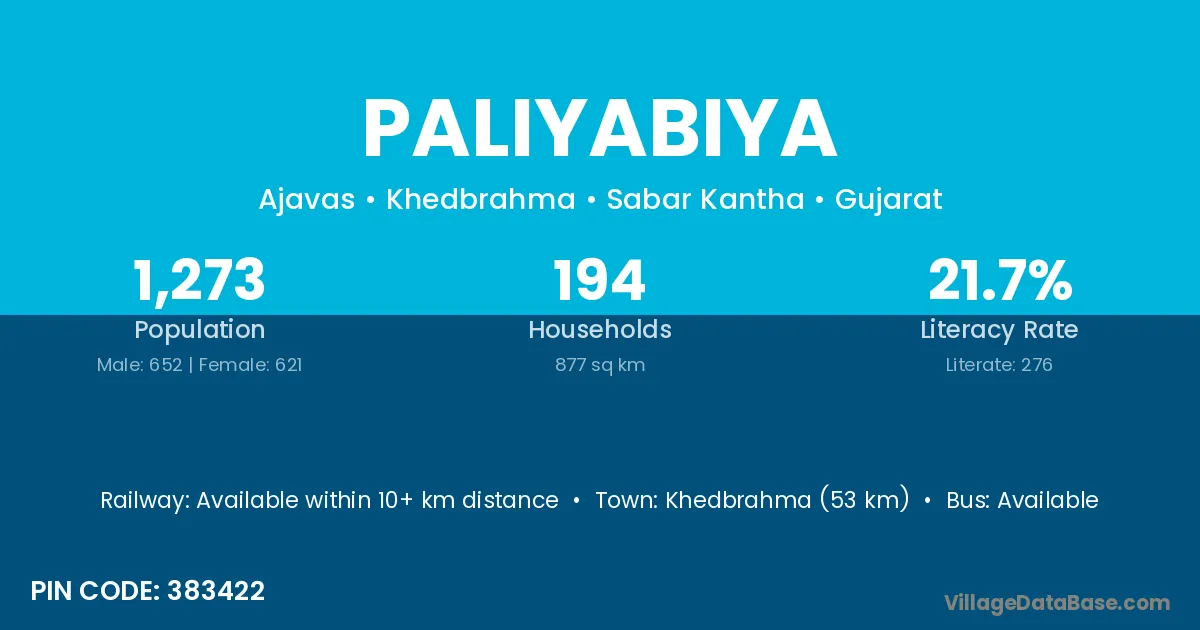 Khedbrahma (53 km) is the nearest town to Paliyabiya village for major economic activities and is located approximately 53 km away.