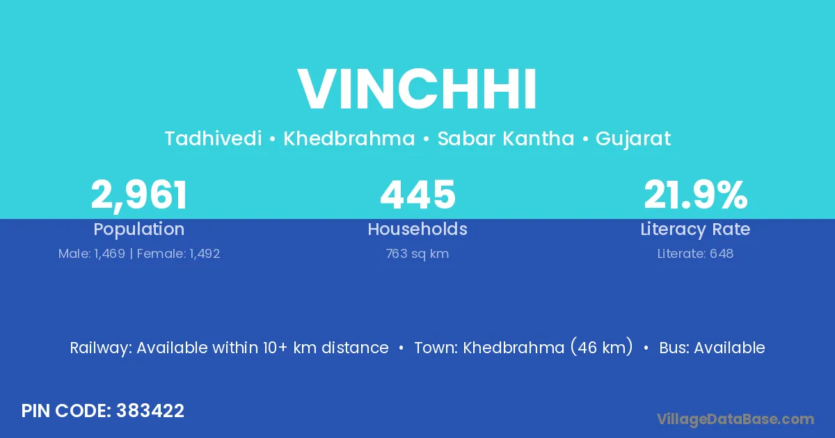 Khedbrahma (46 km) is the nearest town to Vinchhi village for major economic activities and is located approximately 46 km away.