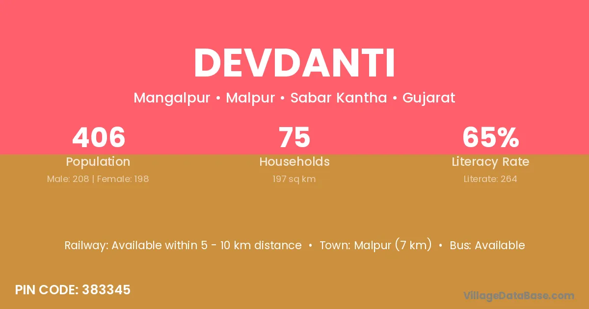 Devdanti village has a total population of 406 people, of which 208 are males and 198 are females.