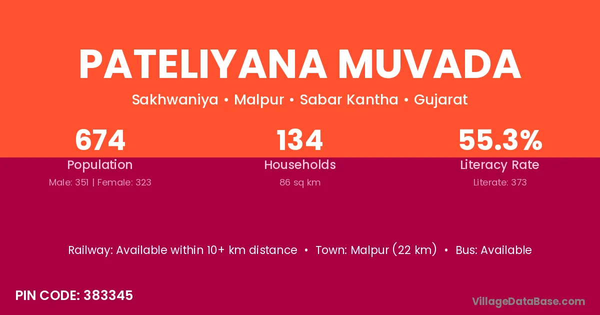 Pateliyana Muvada village has a total population of 674 people, of which 351 are males and 323 are females.