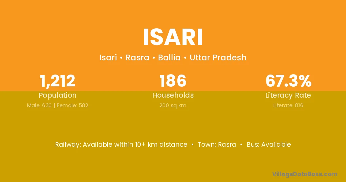 The literacy rate of Isari village is 72.36%. Male literacy stands at 81.40% and female literacy at 62.67%.
