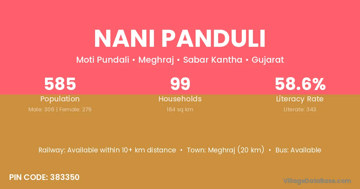 Meghraj (20 km) is the nearest town to Nani Panduli village for major economic activities and is located approximately 20 km away.