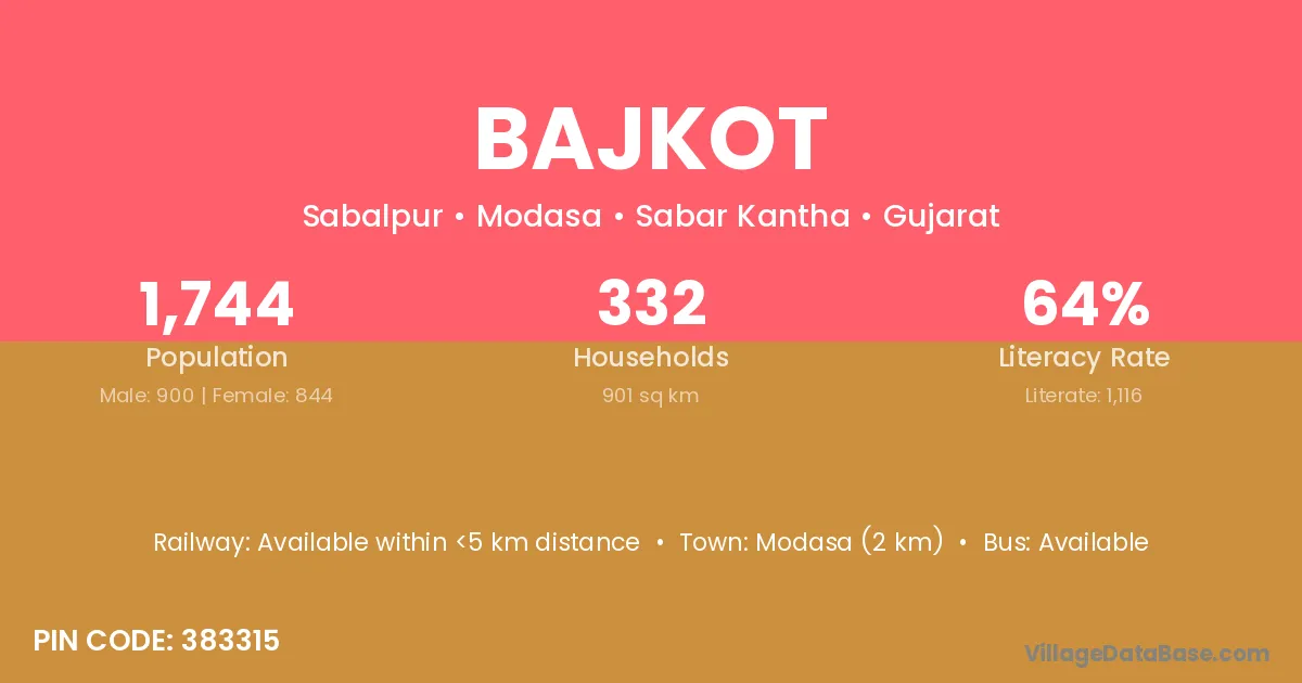 Modasa (2 km) is the nearest town to Bajkot village for major economic activities and is located approximately 2 km away.