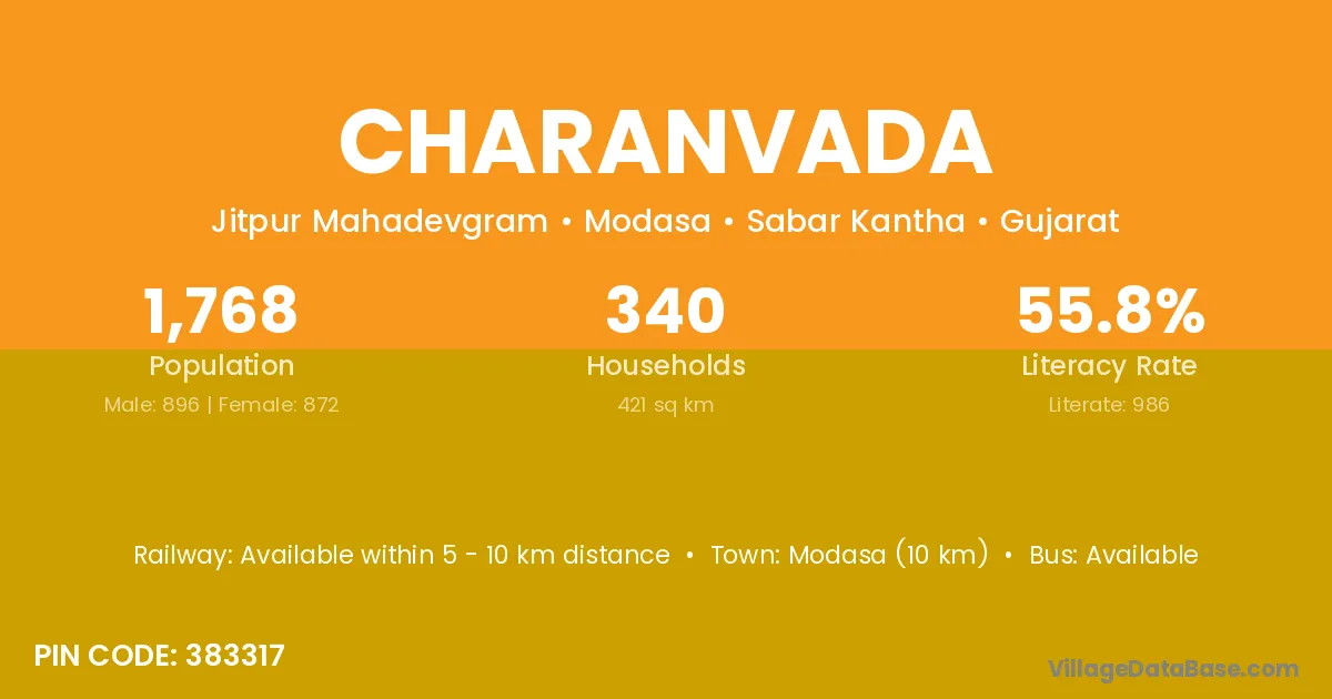 Modasa (10 km) is the nearest town to Charanvada village for major economic activities and is located approximately 10 km away.