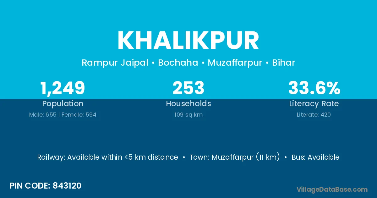 The literacy rate of Khalikpur village is 75.30%. Male literacy stands at 83.07% and female literacy at 65.67%.