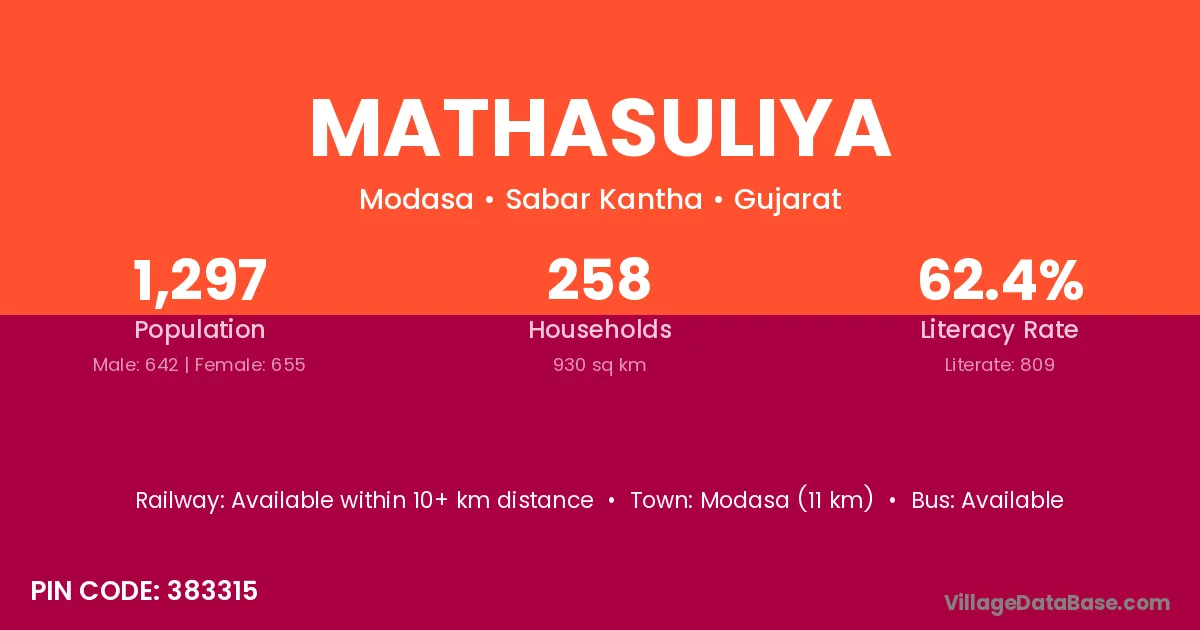 Modasa (11 km) is the nearest town to Mathasuliya village for major economic activities and is located approximately 11 km away.